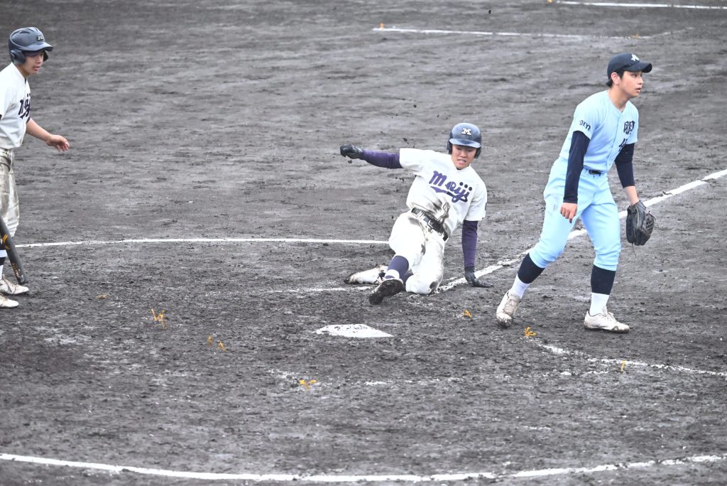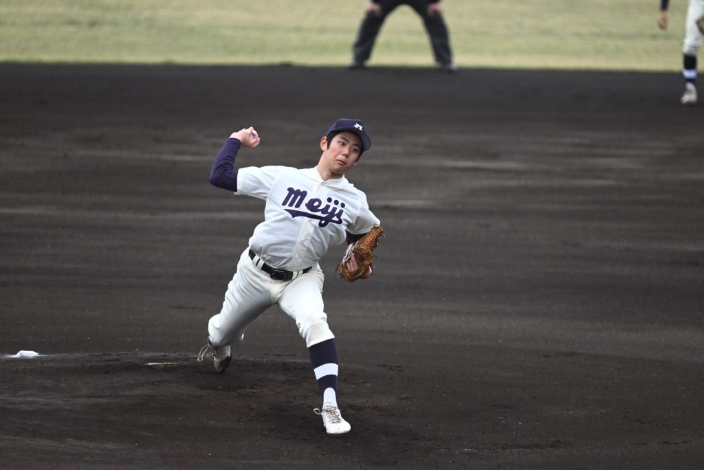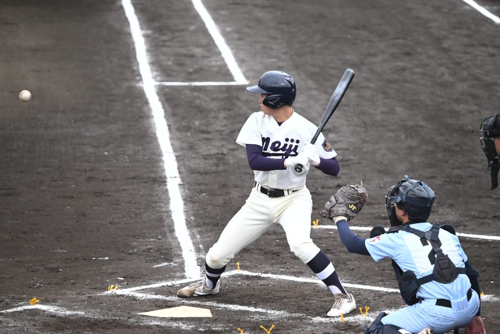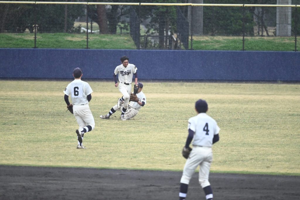 ここで明治はエース小野寺を再びマウンドに戻すも7番バッターに走者一掃のタイムリースリーベースヒットを浴びた。