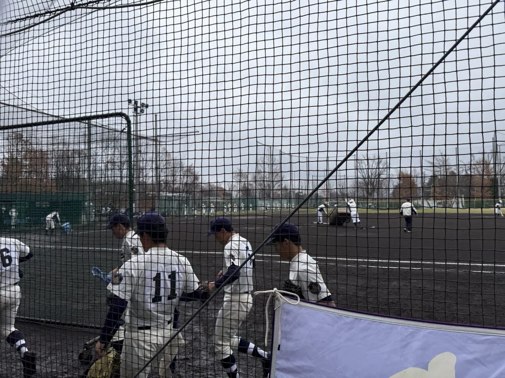 12:23小雨がぱらつく中、両校ウォーミングアップ開始しております。トスバッティングの金属音が心地よい緊張感を高めています。いよいよ試合開始!